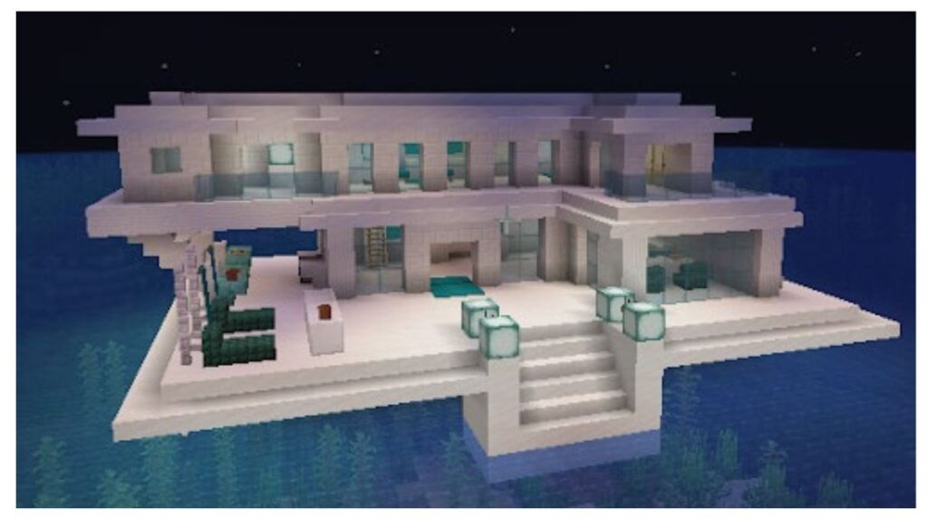 Since pollution and everyone being exposed to toxic gases, families decided to move out of America and to more calm, peaceful, isolated areas such as the ocean. This house is a very open concept and many great features for a house; such as stairs from the ocean to the platform in case anyone wanted it go for a swim, and lounge chairs and an outdoor kitchen for barbecues or parties.