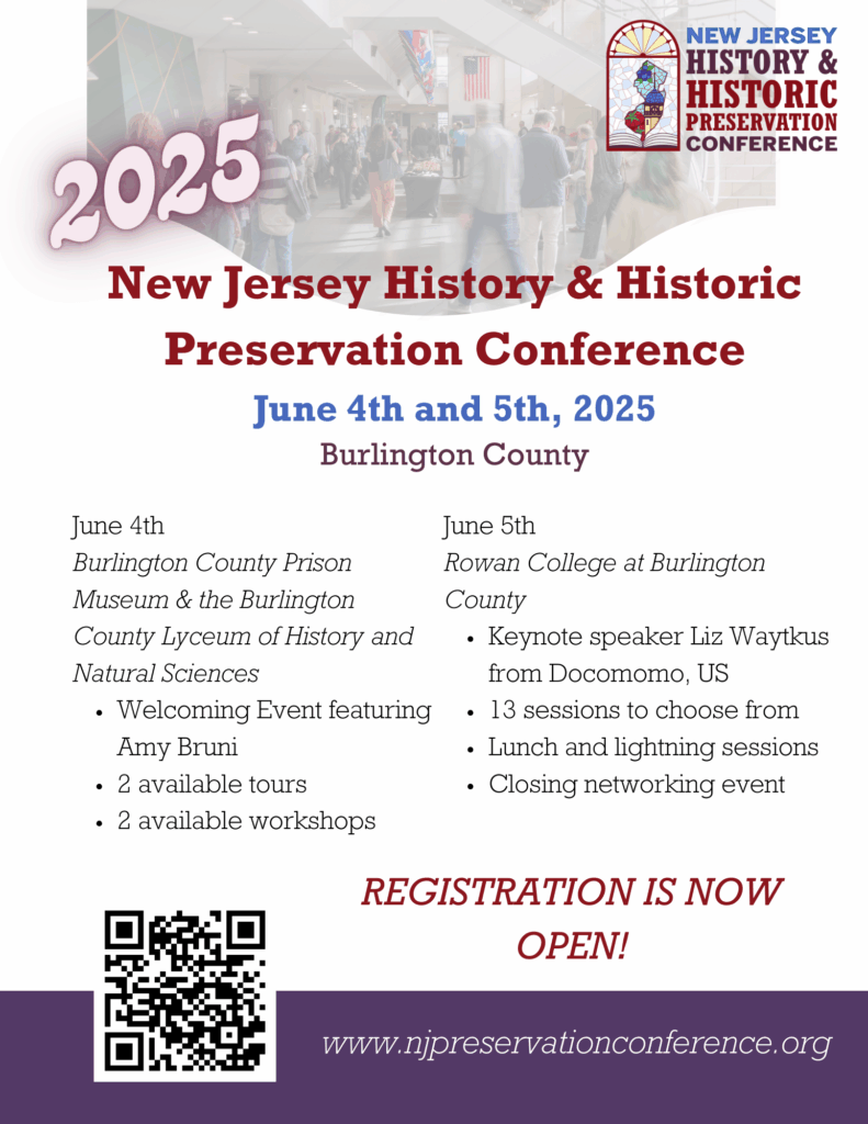 We are excited to announce the New Jersey History and Historic Preservation Conference, taking place on June 4 & 5 in Burlington County, NJ. This event will bring together industry leaders, professionals, and enthusiasts to discuss researching and interpreting underrepresented communities, commemoration, and the value of public history. Other sessions will explore using sustainable materials in preservation, NAGPRA, improving accessibility at historic sites, dark tourism, grant opportunities, attracting and retaining volunteers, and more!