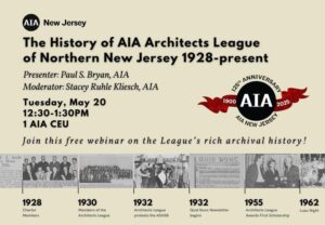 Join the AIA NJ Historical Archives Committee Chair Joyce Scatuccio, Associate AIA; members Elina Shchervinsky, AIA, and Paul Bryan, AIA, and their guest presenters for this remarkable series! The history of AIA New Jersey will be presented in three parts, and each of the six sections will have its own webinar.