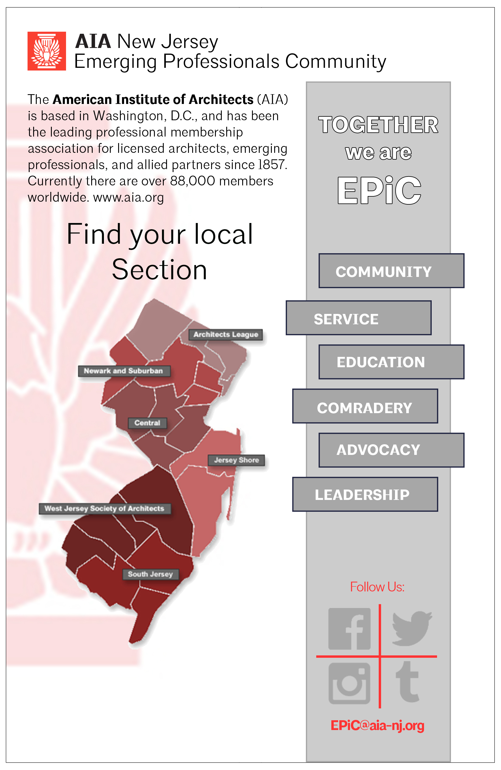 The AIA New Jersey Emerging Professionals Community [EPiC] was created to provide support and resources for emerging professionals through opportunities for Continued Education, Community Service and Advocacy. We work closely with the local AIA New Jersey Sections to coordinate and implement events throughout the state.