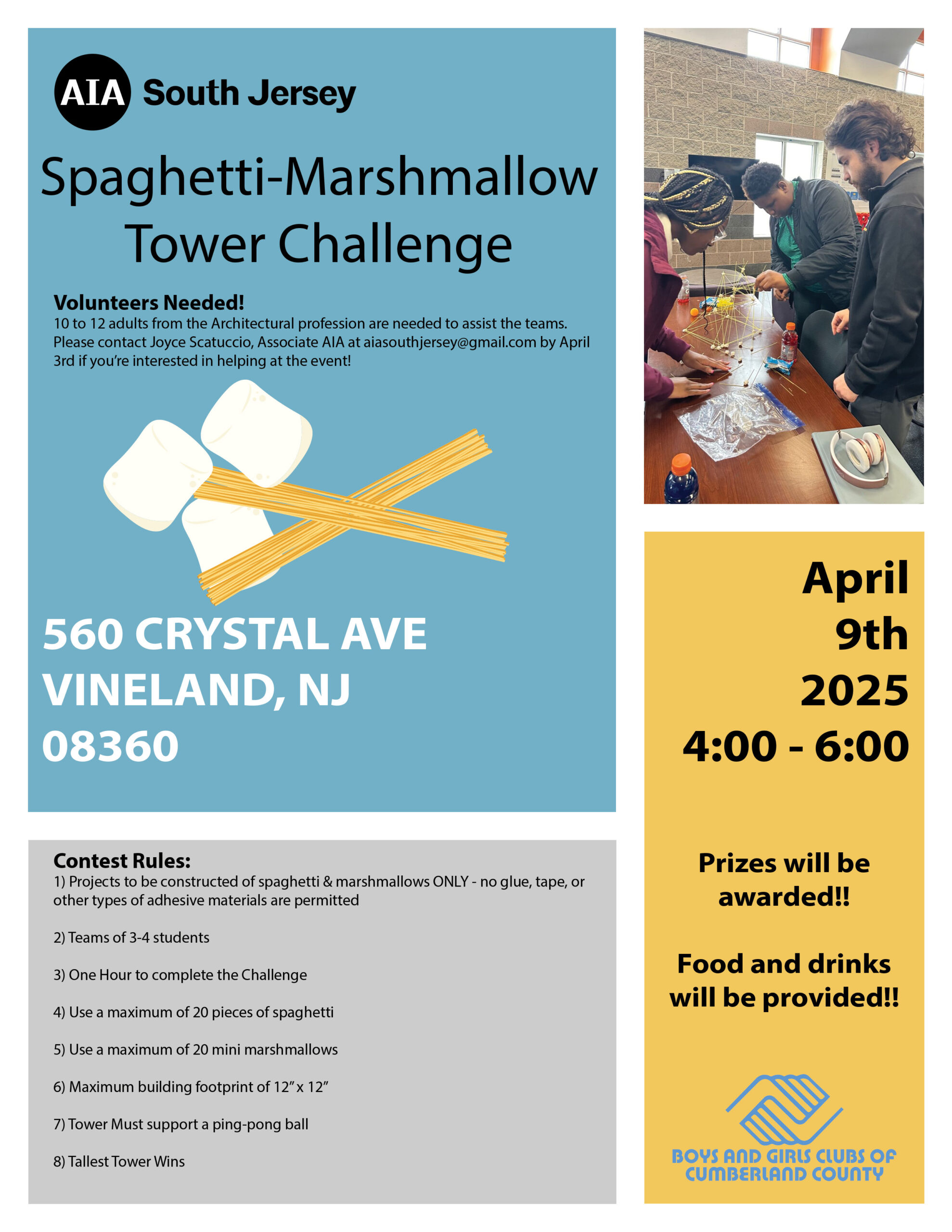 AIA South Jersey will be celebrating this momentous week with our 4th Annual Spaghetti-Marshmallow Tower Challenge on April 9th from 4-6pm at the Boys and Girls Club of Cumberland County in Vineland, NJ.