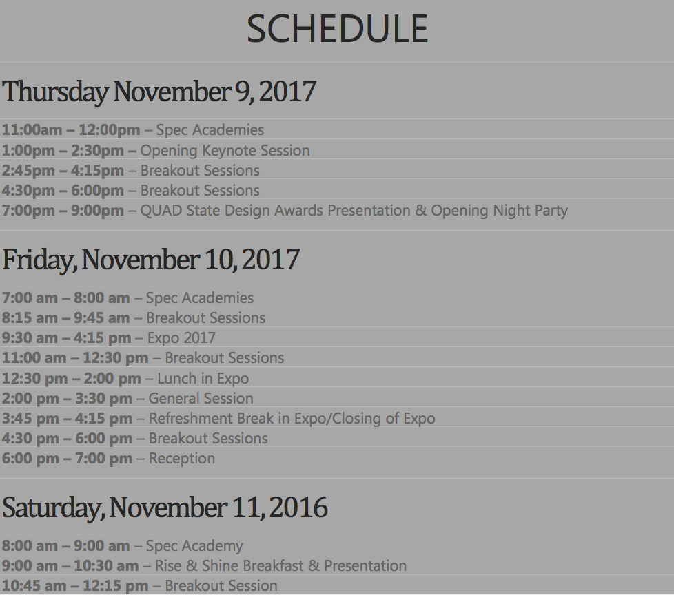 1 Full Day ExpoFrom drones to engineers to printers to the latest in design materials, you will find them at the QUAD State Conference Expo. |