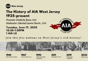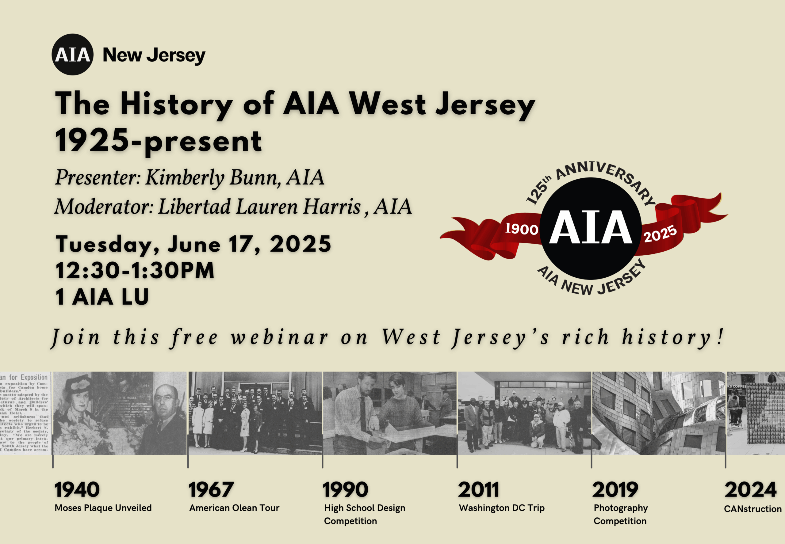 Discover the influential figures, key events, and advocacy efforts that have shaped AIA West Jersey, as well as the professional and societal causes championed by its members. This webinar will also highlight the organization’s ongoing commitment to public education on the critical role of architects in shaping communities.