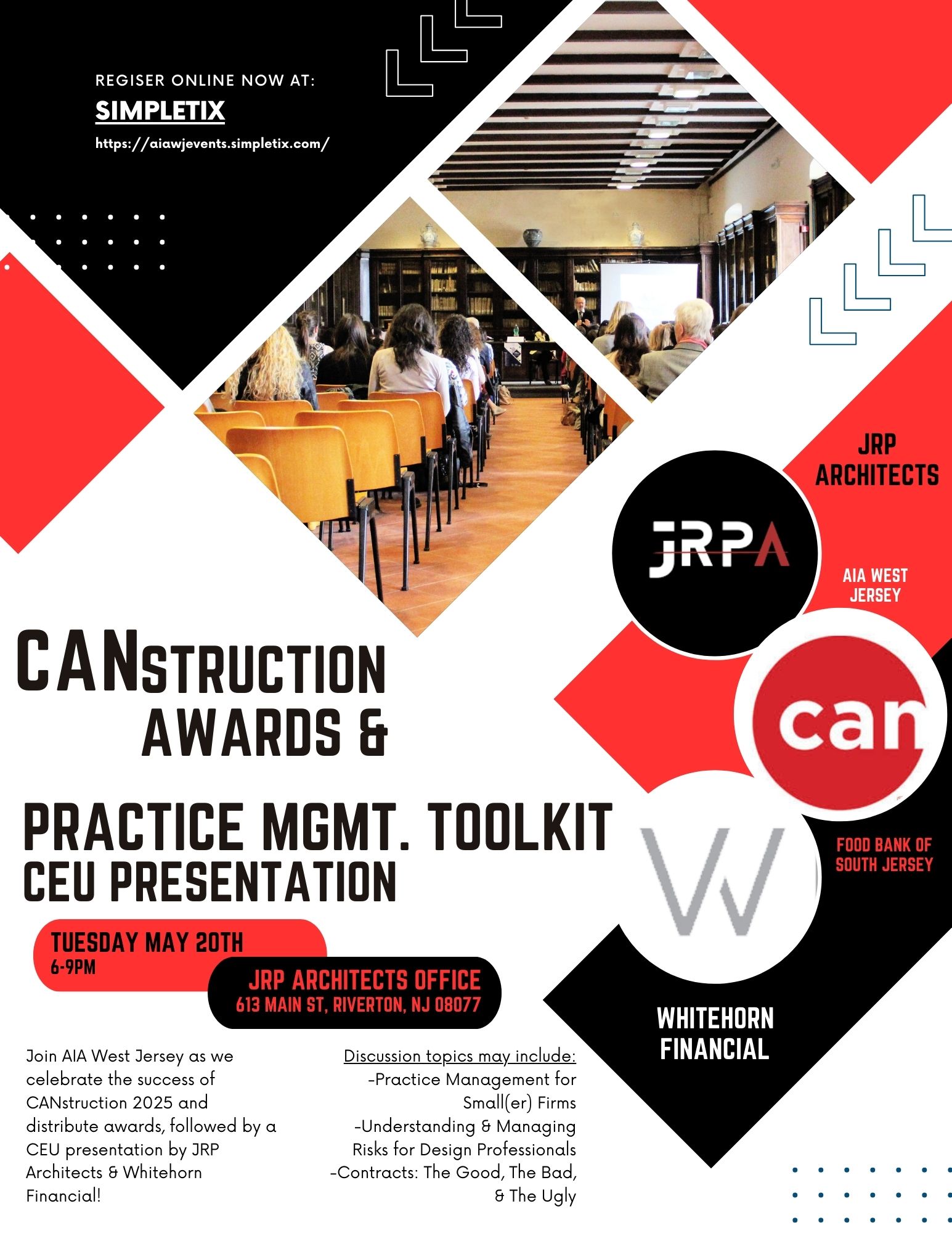 JRP Architects Office 613 Main Street, RivertonJoin AIA West Jersey as we celebrate the success of CANstruction 2025 and distribute awards, followed by a CEU presentation by JRP Architects & Whitehorn Financial! Discussion topics may include: -Practice Management for Small(er) Firms -Understanding & Managing Risks for Design Professionals -Contracts: The Good, The Bad, & The Ugly
