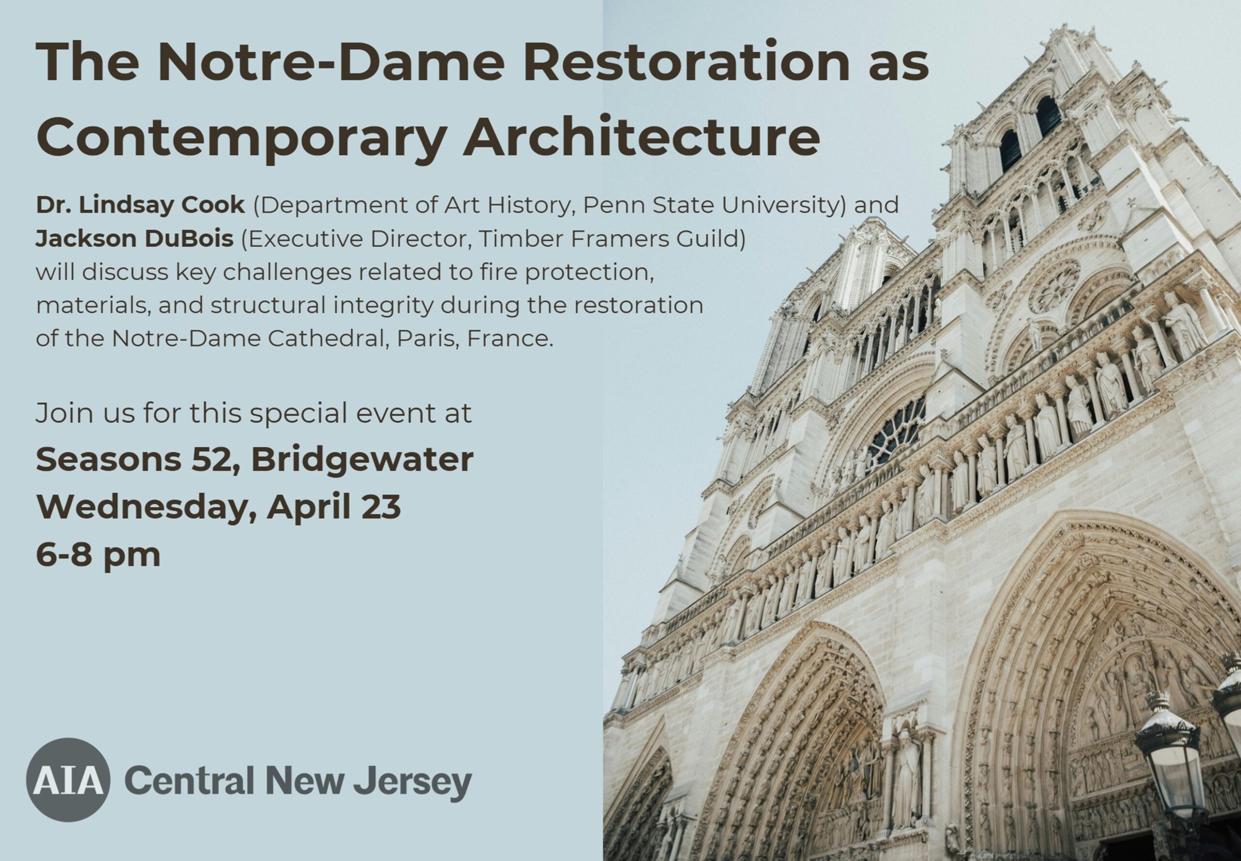 Join Central New Jersey us on April 23, from 6-8 PM at Seasons 52 in Bridgewater for a presentation on the restoration of Notre-Dame Cathedral. Dr. Lindsay Cook and Jackson DuBois will explore the impact of the 2019 fire, addressing fire protection, structural integrity, and the role of modern technology in preserving historic buildings. They Read More